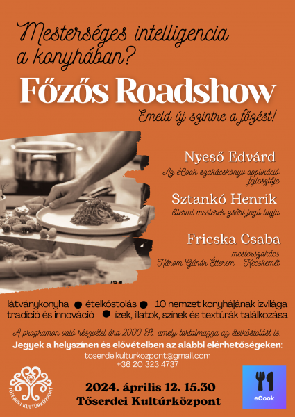 A Tőserdei Kultúrközpont Archeum rendezvényháza ezúttal egy igazán innovatív projekthez kapcsolódó eseménynek ad otthont. A rendhagyó látványfőzéssel összekapcsolt kóstoló nemcsak az ízlelőbimbókra lesz hatással, hanem gondolatainkat is megmozgatja, hiszen az eCook mesterséges intelligencián alapuló online szakácskönyv applikáció fiatal tervezője, Nyeső Edvárd lesz az estebéd témájának szolgáltatója.